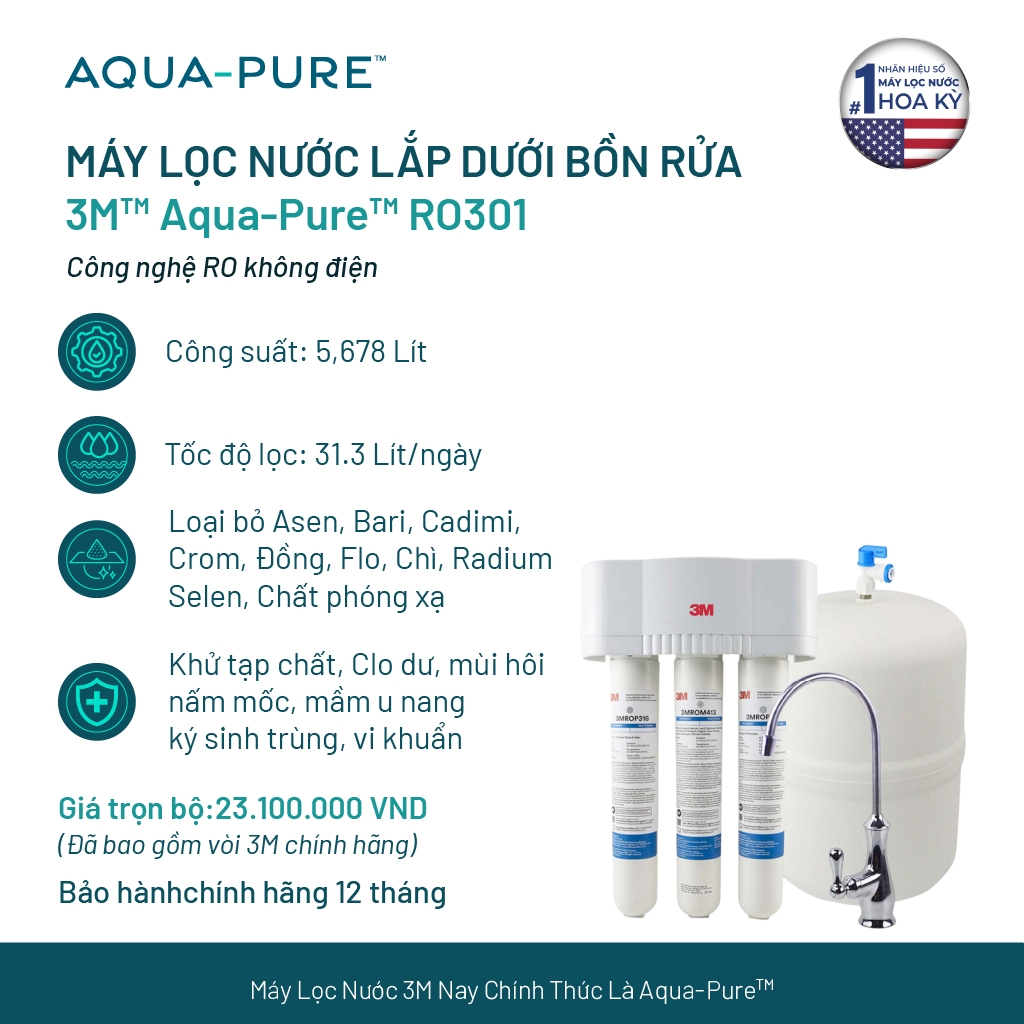 MODEL: Máy lọc nước 3M™ Aqua-Pure™ RO301 - Công nghệ RO không cần điện