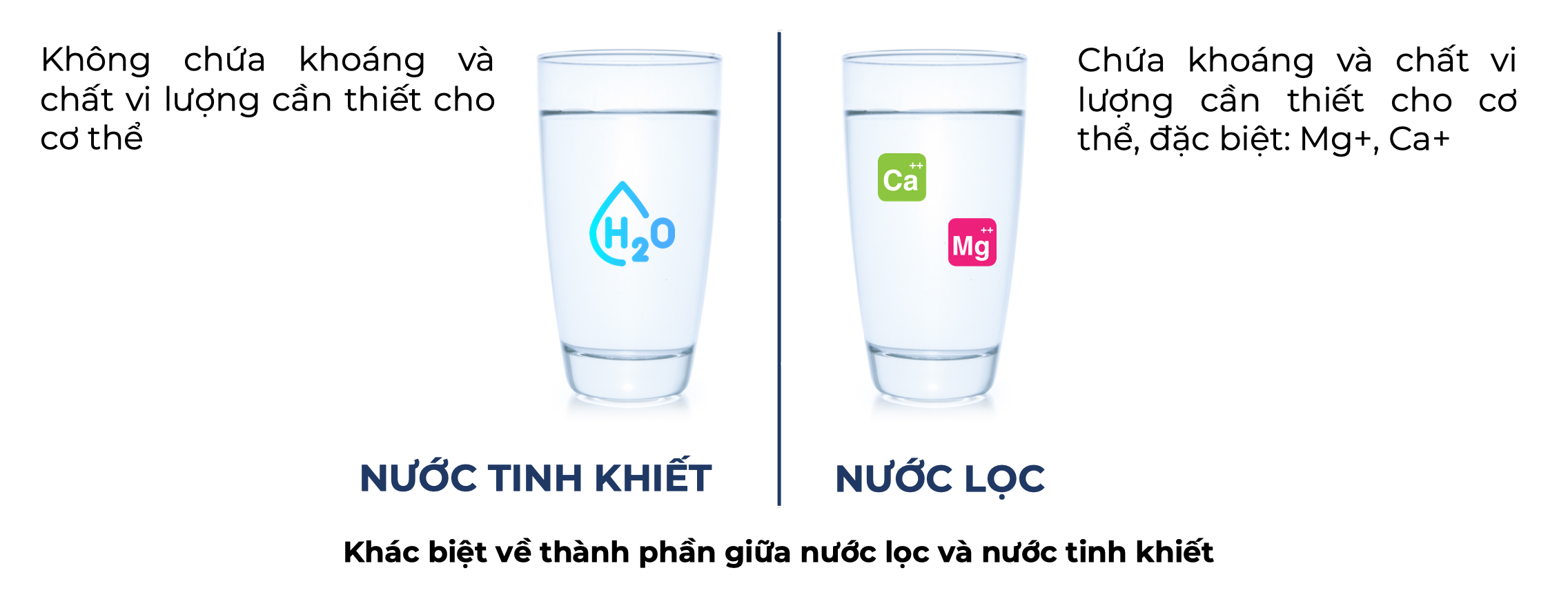 Với nước tinh khiết được lọc từ công nghệ RO, được gọi là “nước chết”, thì bị mất hết các khoáng chất vi lượng có lợi cho sức khoẻ. Nếu sử dụng loại nước này lâu ngày sẽ gây hại cho cơ thể. Trong trường hợp sử dụng lõi bù khoáng, thì những khoáng chất này đều là nhân tạo hoàn toàn không tốt cho cơ thể. Các lõi lọc sử dụng thời gian dài sẽ bị nhiễm khuẩn, nhiễm bẩn, không những không tạo ra khoáng chất cần thiết mà còn là nguồn gây bệnh cho người dùng.